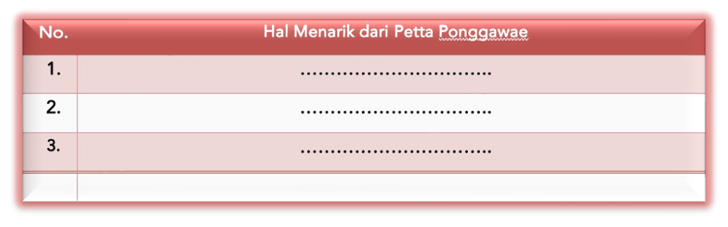Setelah menyimak kisah kepahlawanan Petta Ponggawae dengan saksama, kalian diajak untuk menyelami lebih dalam nilai-nilai yang terkandung didalamnya. Berikut ini adalah lembar kerja untuk mencatat tiga poin utama atau hal menarik yang merepresentasikan karakter, peristiwa, maupun pesan moral yang paling berkesan bagi kalian.